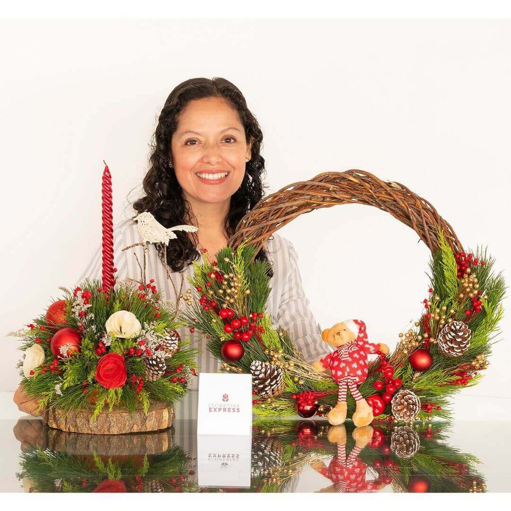Bello combo formado por Centro de Mesa + Aro para puerta elaborados con pino natural, tienen aroma a limón y están decorado con flores secas pintadas y detalles artificiales. Diámetro del aro de puerta 45 cm.