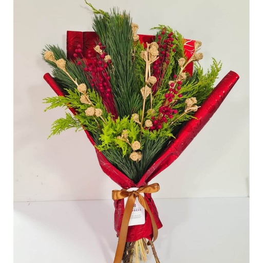 Combo navideño completo formado por: Arreglo alto de aprox. 80 cm + Centro de mesa + Corona de Adviento y Aro de Puerta. Todo elaborado con pino natural, flores secas pintadas y detalles artificiales. Diámetro del aro de puerta 45 cm.